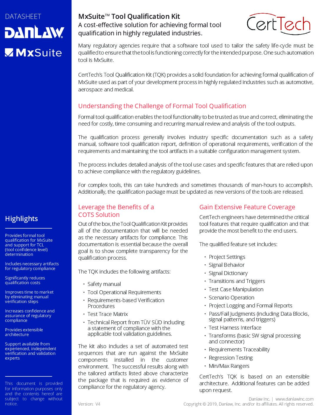 In addition, MxSuite supports customers qualifying their product to standards like ISO 26262 and DO-178C using their own development process with CertTech’s Tool Qualification Kit. It covers evidences where the use of ‘qualified tools’ for verification and validation (V&V) activities is required.